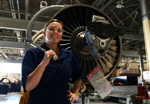 U.S. Air Force Senior Airman Athena Kline, 20th Component Maintenance Squadron aerospace propulsion journeyman, poses for a picture in front of a F-129B engine at Shaw Air Force Base, S.C., Sept. 7, 2016. The aerospace propulsion flight is responsible for rebuilding, repairing and performing