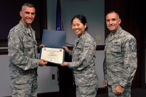 U.S. Air Force Capt. Sarah Curry, 20th Dental Squadron general dentist, center, is recognized as the Shaw “Weasel of the Week” by Col. Daniel Lasica, 20th Fighter Wing (FW) commander, left, and Chief Master Sgt. Daniel Hoglund, 20th FW command chief, at Shaw Air Force Base, S.C., Aug. 16, 2017.