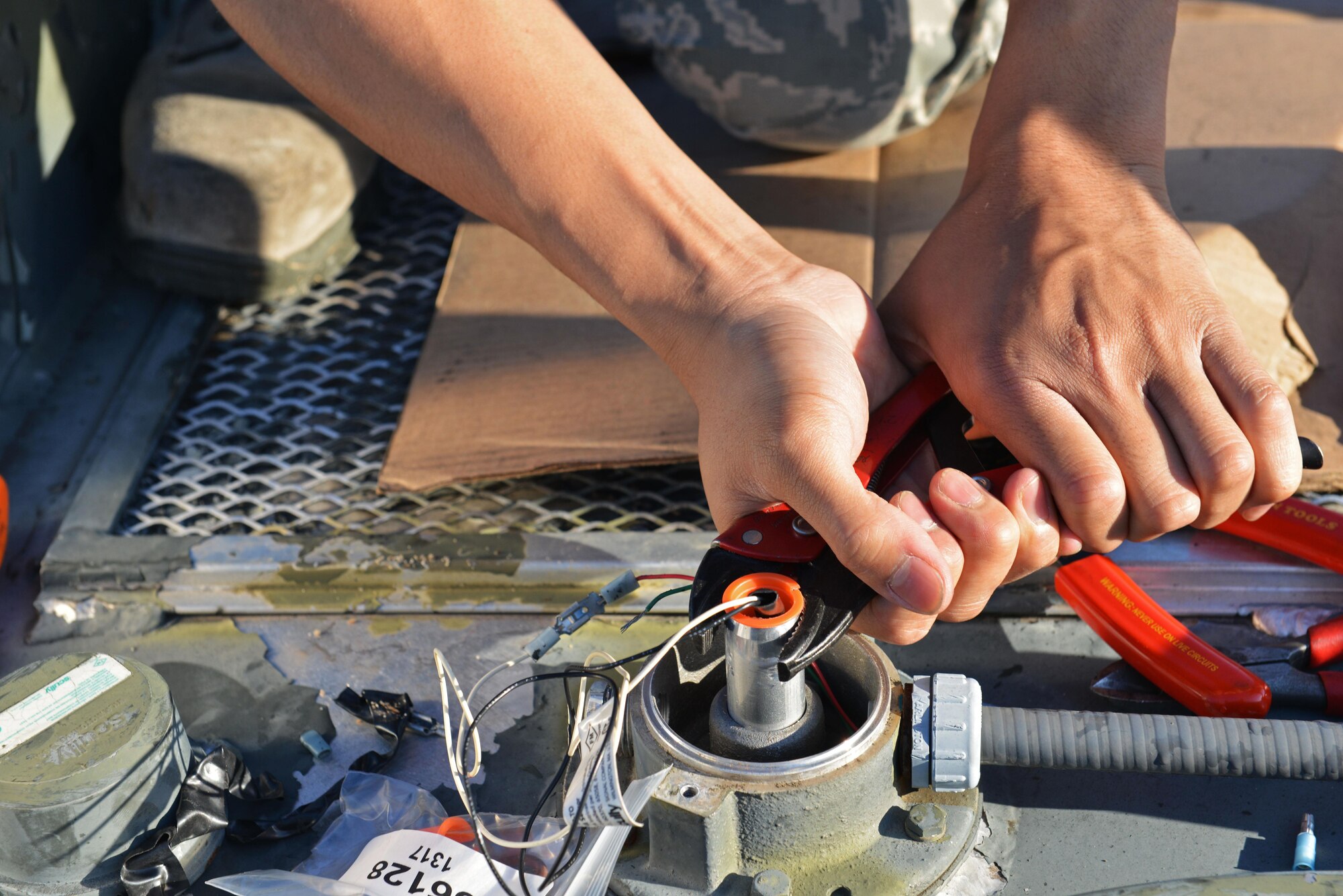 U.S. Air Force Airman 1st Class Yves Xavier Yap, 20th Logistics Readiness Squadron (LRS) fire truck and refueling maintainer, front left, Milton Kyle, 20th LRS refueling vehicle mechanic, back left, and Tech. Sgt. Dwain Burton, 20th LRS refueling maintenance noncommissioned officer in charge, gather tools to use on an R-11 refueling truck at Shaw Air Force Base, S.C., April 27, 2017. The three are part of the refueling maintenance flight and are responsible for 19 vehicles used to fuel F-16CM Fighting Falcons. (U.S. Air Force photo by Airman 1st Class Destinee Sweeney)