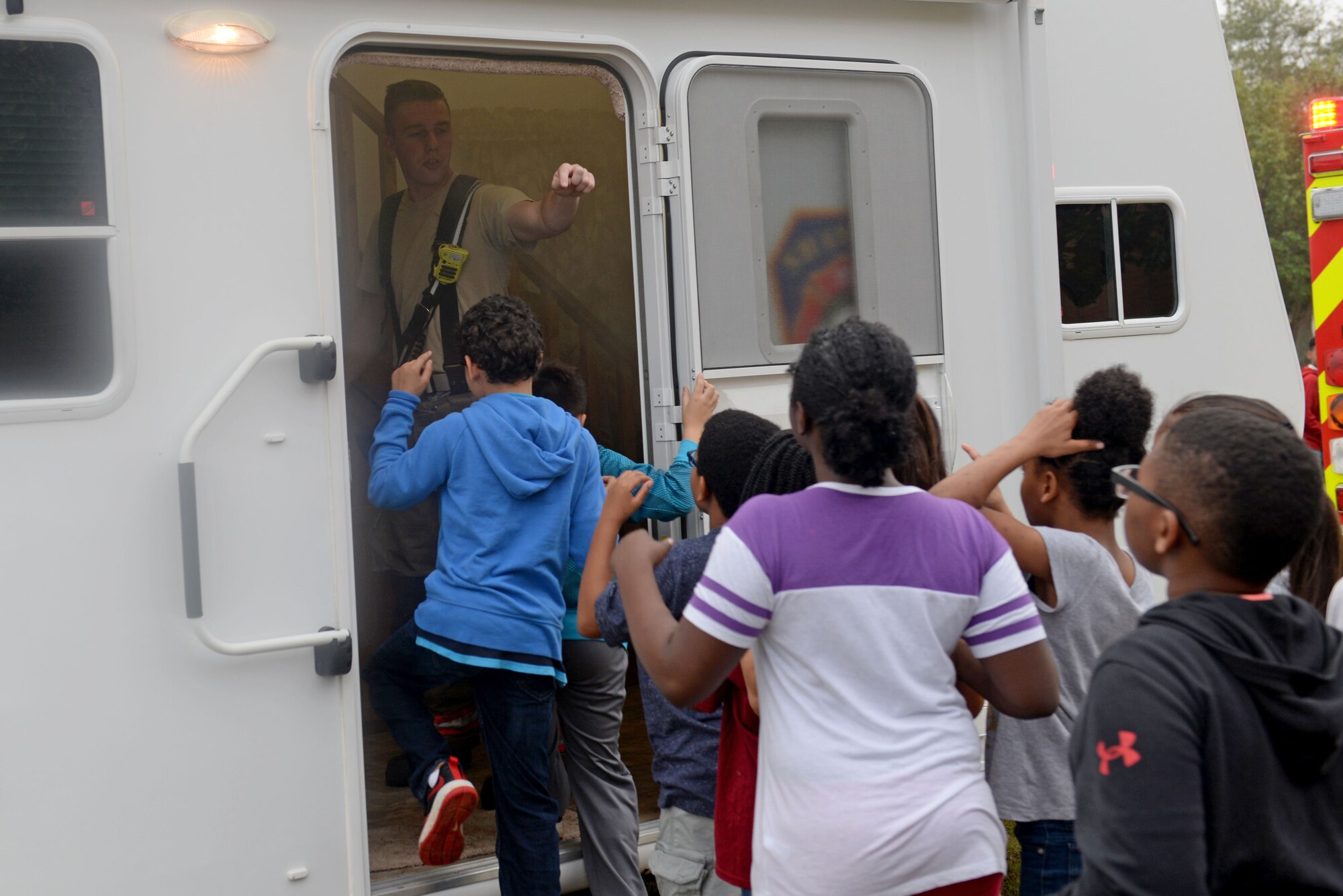 U.S. Air Force Airman 1st Class Richard Palmer, 20th Civil Engineer Squadron (CES) firefighter, counts children in line for a Fire Safety House during Fire Prevention Week at Shaw Air Force Base, S.C., Oct.12, 2017. During the week, 20th CES firefighters educated the local community about fire prevention and safety. (U.S. Air Force photo by Airman 1st Class Destinee Sweeney)