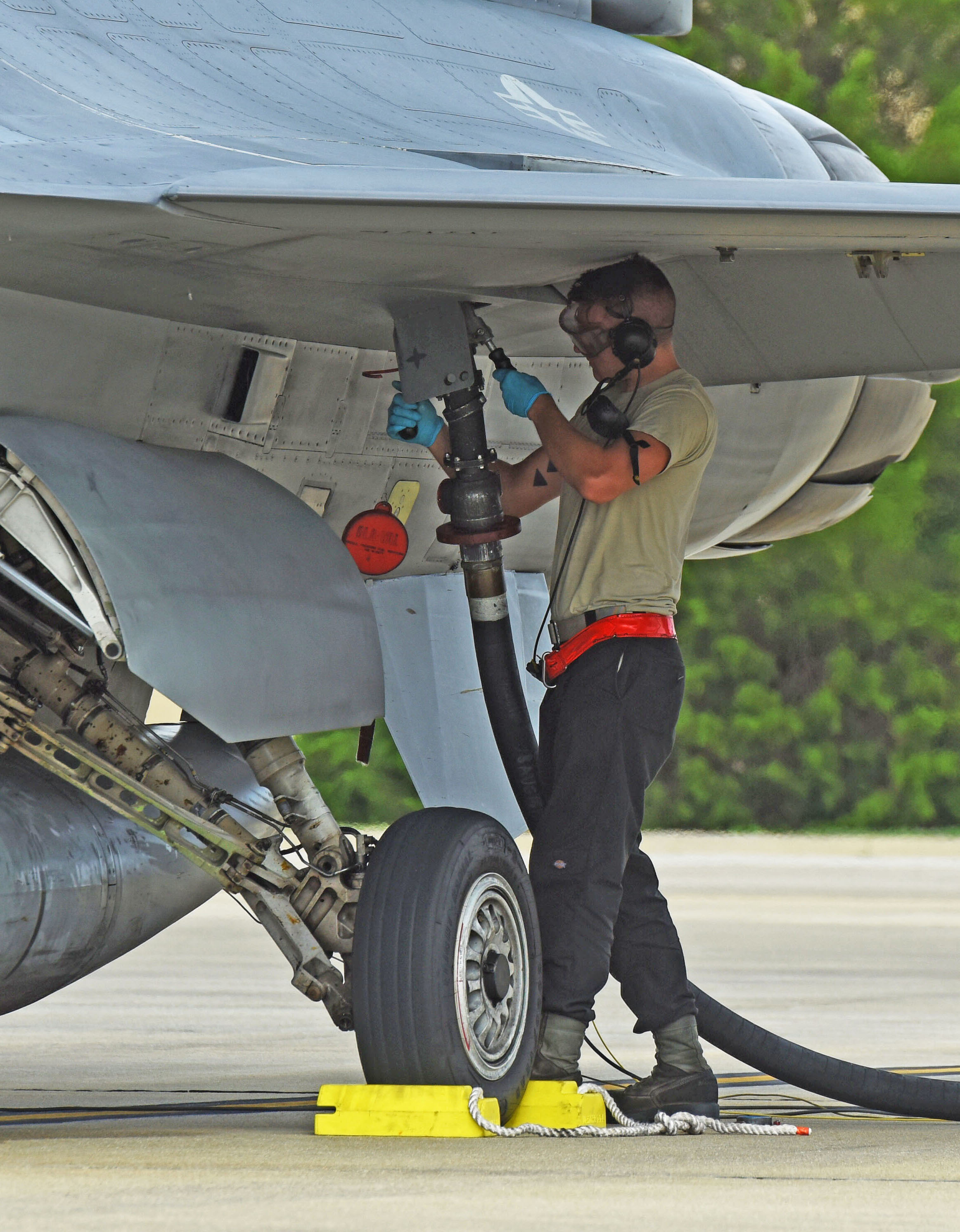 U.S. Air Force Airman 1st Class Joey Albright, left, and Staff Sgt. Jameson Holmes, 20th Aircraft Maintenance Squadron (AMXS) tactical aircraft maintainers, work together to untangle a cable at Shaw Air Force Base, S.C., June 26, 2018. Airmen assigned to the 20th AMXS came up with a new procedure for Team Shaw to get F-16CM Fighting Falcons refueled quicker, pilots more flying time. (U.S. Air Force photo by Airman 1st Class BrieAnna Stillman)