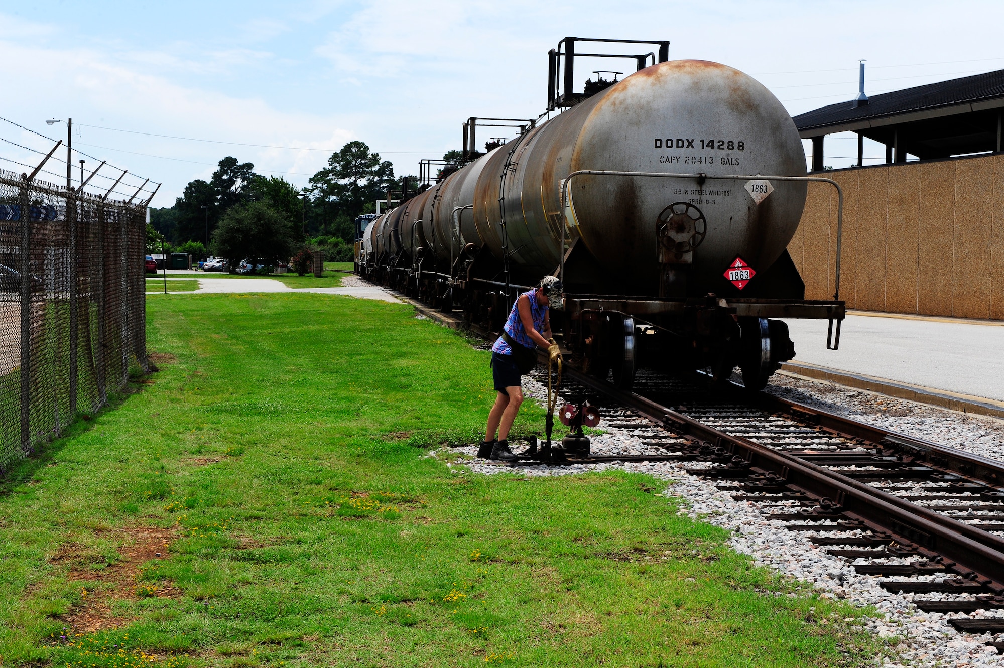Michelle Hill (left), 20th Logistics Readiness Squadron D-Flight conductor/engineer, opens the fueling station gates and uncouples the rear cars from the locomotives (lead cars) as Adam McDowell, 20th LRS D-Flight engineer/conductor waits to receive confirmation before moving the locomotives at Shaw Air Force Base, S.C., Aug. 09, 2012. Due to the fact that the locomotives are limited by the directions they may move while carrying a load, precise and calculated steps must be taken to dock the tank cars for fueling. This process could involve moving, coupling and uncoupling multiple cars, multiple times, to properly maneuver the right cars into the fueling station. (U.S. Air Force photo by Airman 1st Class Daniel Blackwell/Released)