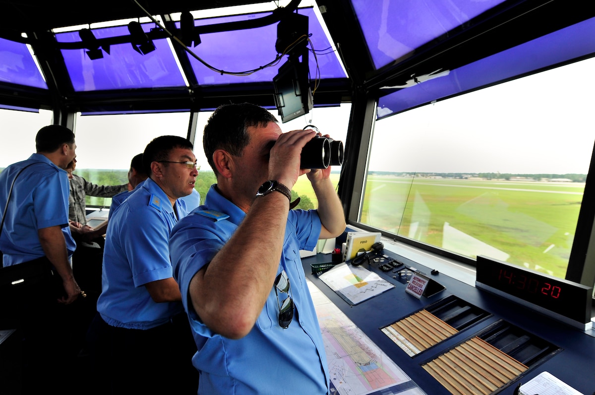 Kazakhstan Air Defense Forces Col. Murat Kazhmuratov, main directorate for supervision over aviation safety, asks questions about Shaw’s flight tower operations, Sept. 19, 2012, Shaw Air Force Base, S.C. The Kazakhstan ADF visited Shaw for two days to learn about the 20th Fighter Wing’s safety programs and how they work. (U.S. Air Force photo by Staff Sgt. Kenny Holston/Released)