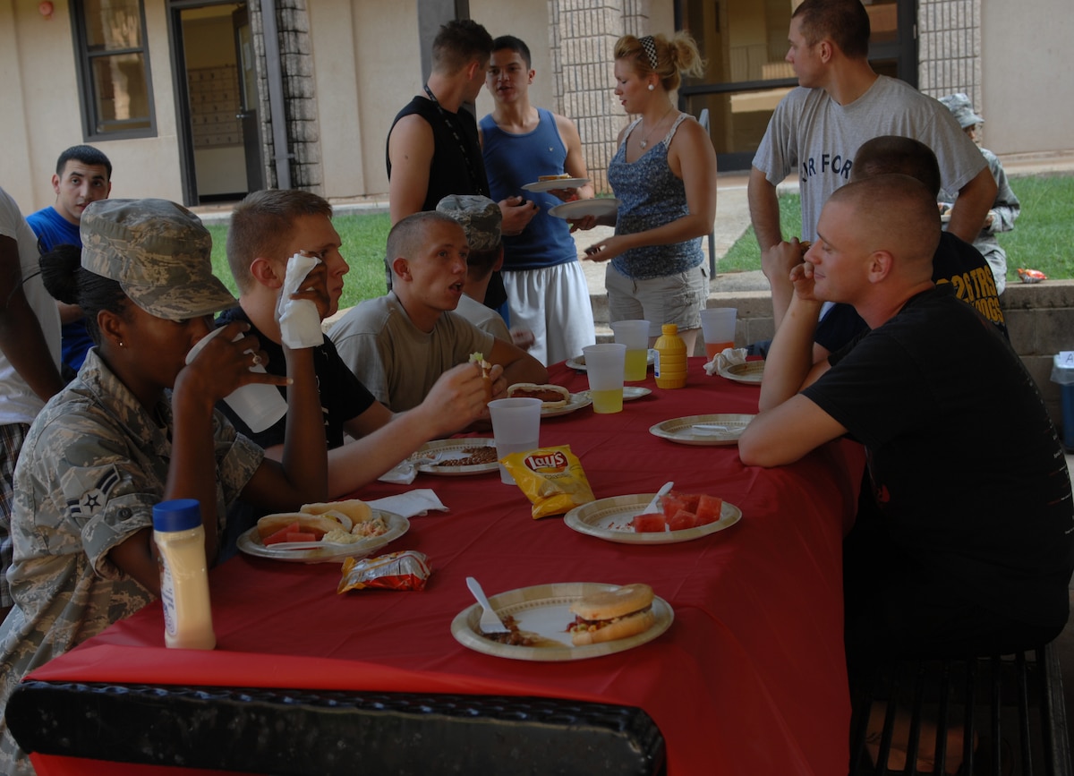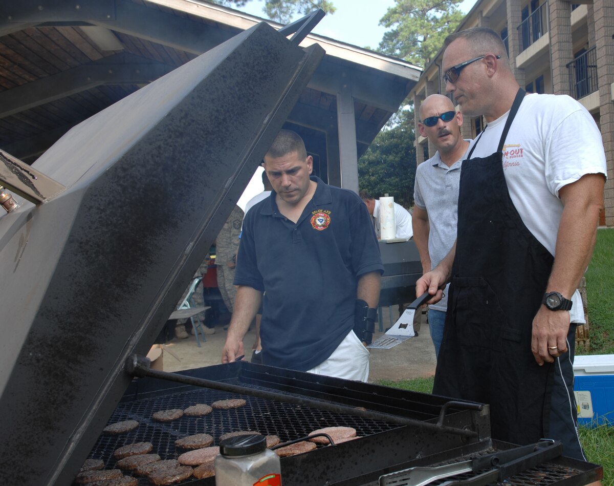 (From left to right) Senior Master Sgt. Matthew Clegg, 20th Civil Engineering Squadron deputy fire chief, Senior Master Sgt. Jerry Dire, 20th Communications Squadron systems superintendent, and Master Sgt. Mike Jordan, U.S. Air Forces Central A2 division non-commissioned officer in charge, grill burgers for the dorm dinner here, July 13, 2010. The dorm dinner is usually held the second Tuesday of each month. (U.S. Air Force photo/ Airman 1st Class Alexandria Mosness)
