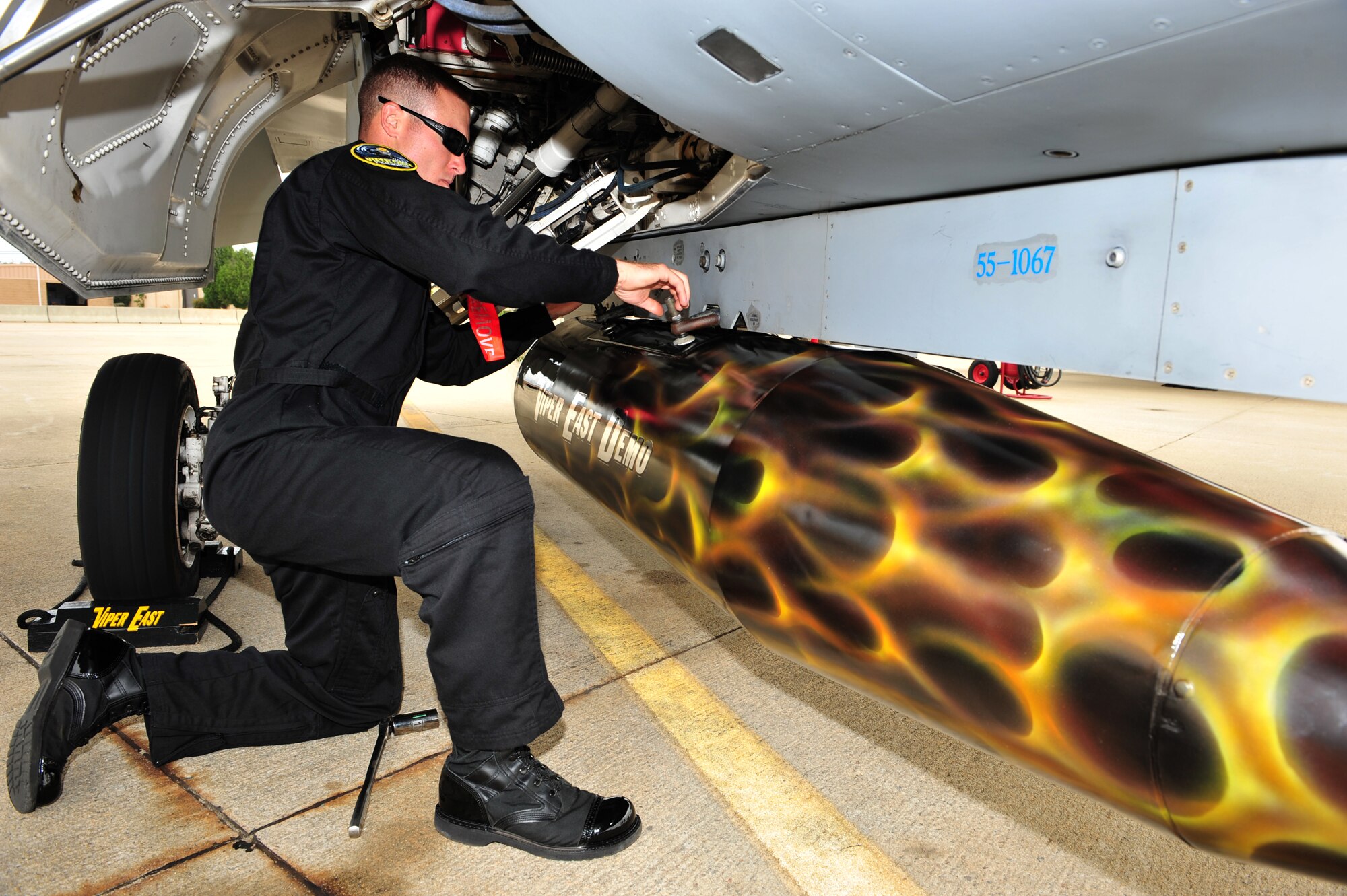 SHAW AIR FORCE BASE, S.C.- Senior Airman Anthony J. Modugno, background, and Staff Sergeant James A. Griggs, both dedicated crew chiefs of the Viper East F-16 Demonstration Team, carry a travel pod into position so it can be hung on the F-16 aircraft. The pair volunteered their personal time refinishing the pod over a two-week period to bring it up to show standards, May 14, 2009. (U.S. Air Force Photo by: Tech. Sgt. Josef Cole)