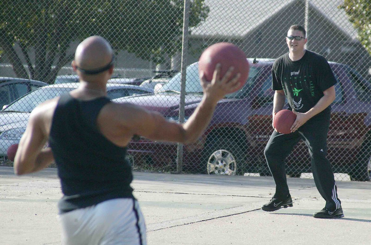SHAW AIR FORCE BASE, S.C. -- Staff Sgt. Jarod Jones, 20th Equipment Maintenance Squadron, throws the ball to Staff Sgt. Wesley Rudin, 20th EMS, in a dodge-ball practice game during the Viper Challenge Sept. 27. The Wing Sports Day Viper Challenge occurs annually with many different sporting events going on throughout the day. Unit teams are formed to participate in the events and the unit that has accumulated the most points at the conclusion of the last Viper Challenge event will be declared the winner and receive the coveted Commander's Cup. (U.S. Air Force/Senior Airman John Gordinier)