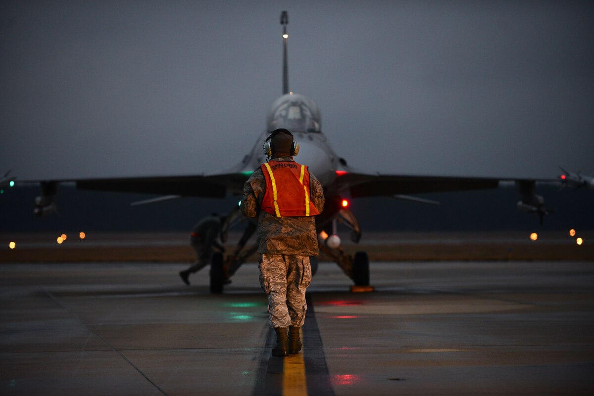 U.S. Air Force Staff Sgt. Kathleen Brophy, 20th Aircraft Maintenance Squadron tactical aircraft maintainer, inspects the exhaust of an F-16CM Fighting Falcon during a surge at Shaw Air Force Base, S.C., Jan. 13, 2015. The thrust of an F-16 is 27,000 pounds, pushing the fighter jet to speeds of more than 1,500 miles per hour, or approximately Mach two, at altitude. (U.S Air Force photo by Airman 1st Class Diana M. Cossaboom/Released)