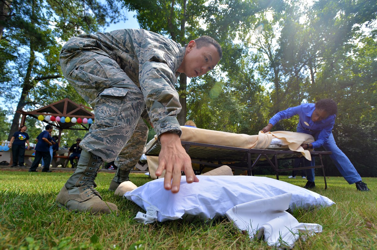 (From left) Susan Johnson, Carolina Pines Inn lodging manager, and Beatriz Ortizcastillo, Carolina Pines Inn housekeeper, place a sheet on a bed during a bed making competition held as part of international housekeeping week, Shaw Air Force Base, S.C., Sept. 13, 2013. International housekeeping week is an Air Force-wide event, held on many bases to show appreciation for the hard work that housekeepers do and give them a chance to relax and have fun. (U.S. Air Force photo by Airman 1st Class Jensen Stidham/Released)