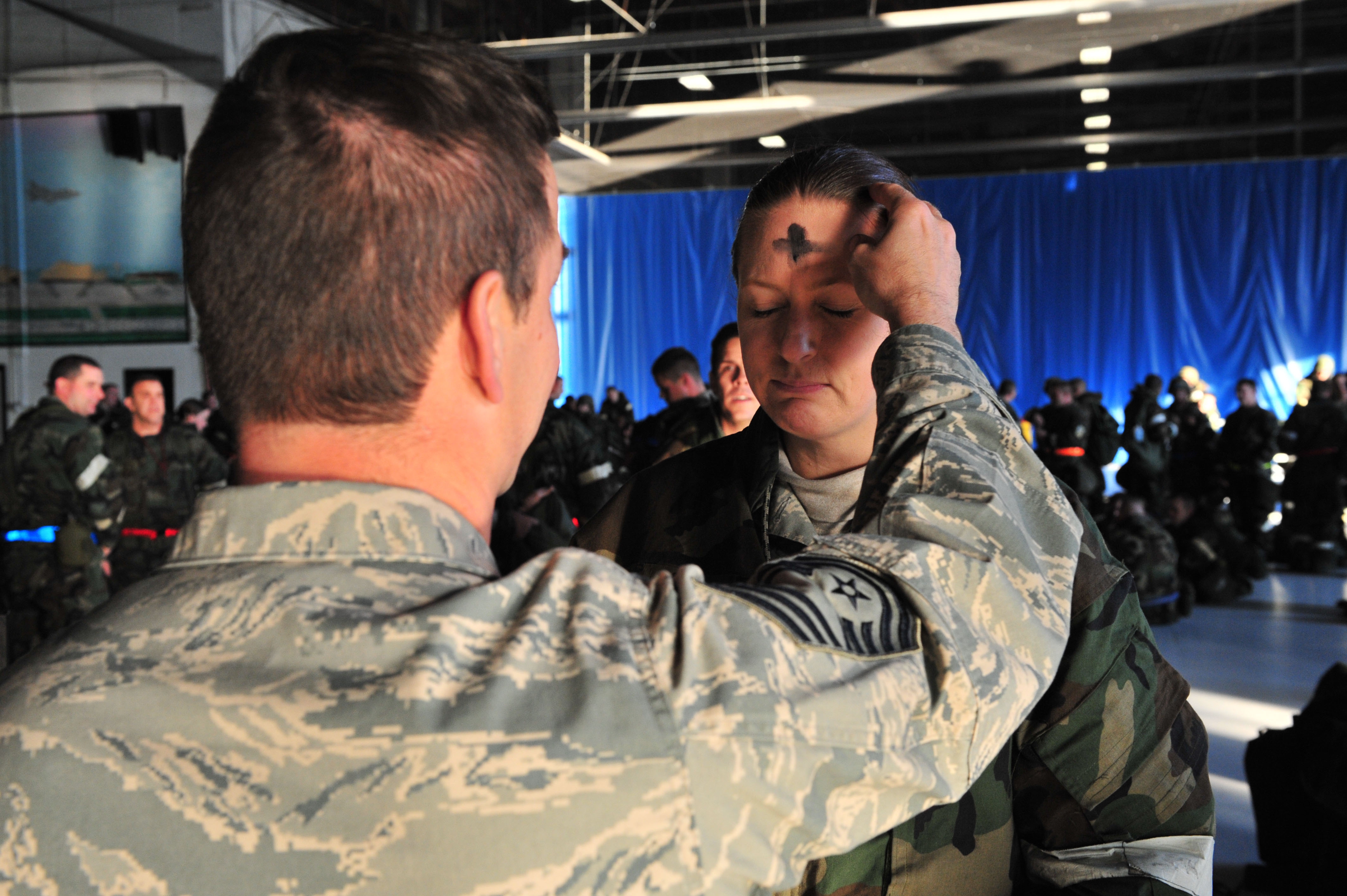 SHAW AIR FORCE BASE, S.C.-- Chief Master Sgt. Henry P. Gillen, USAFCENT chief of Air Traffic Control Services, places a cross of ashes and oil for Ash Wednesday on the forehead of Master Sgt. Tanya M. Carbone, 77 Aircraft Maintenance Unit First Sergeant. Chief Master Sgt Gillen volunteered along with Chaplain (Capt.) Kelvin Francis, to perform the service during an operational readiness exercise providing players the opportunity to participate who would normally be unable due to their work schedules. Ash Wednesday is a ceremony mostly practiced by Catholics. (U.S. Air Force Photo by Tech. Sgt. Josef Cole)