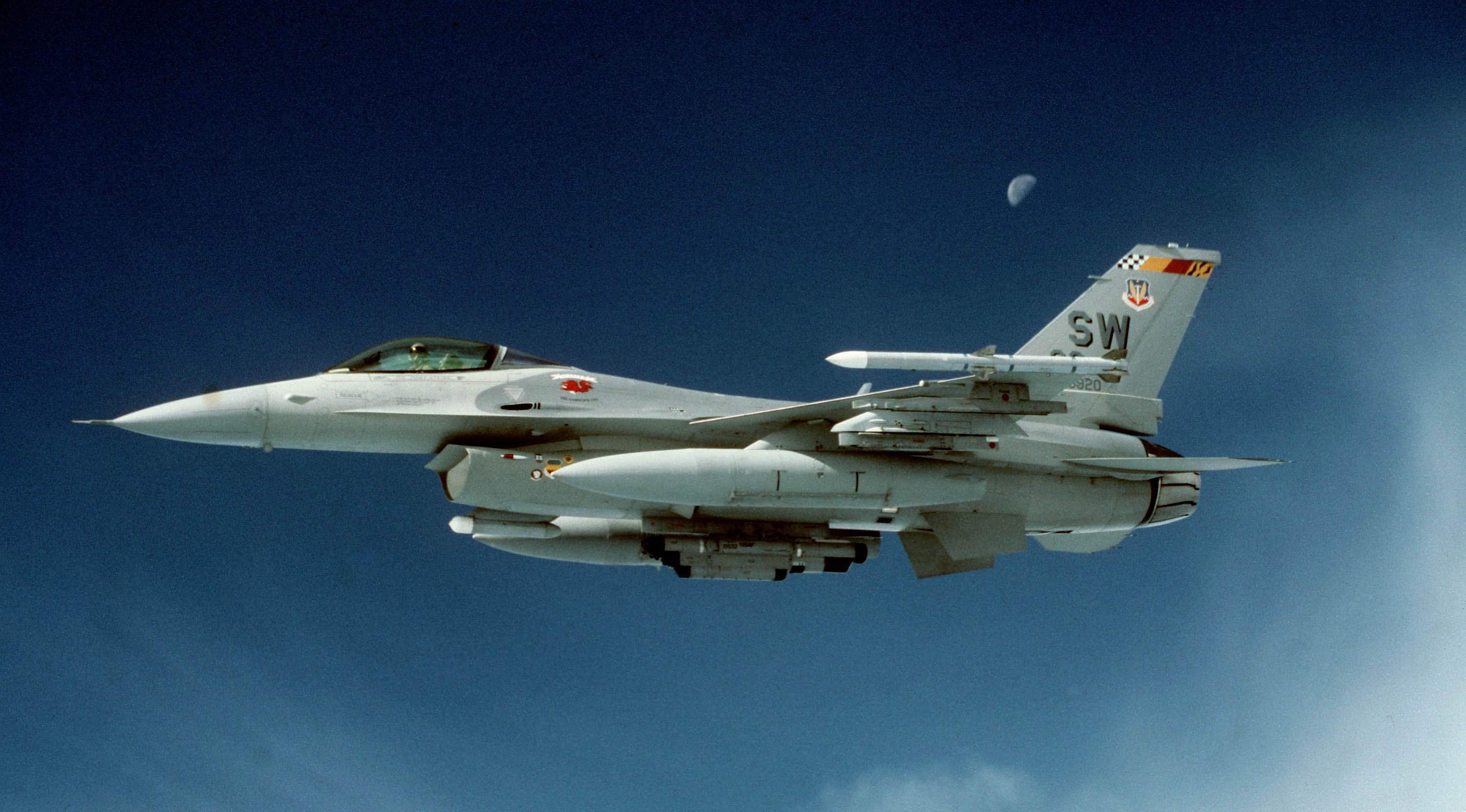 FILE PHOTO -- An F-16C Fighting Falcon, with moon in the background, flies a local training mission. This F-16 is the flagship aircraft of the 20th Fighter Wing, Shaw AFB, S.C. (U.S. Air Force photo by Senior Airman Greg Davis)