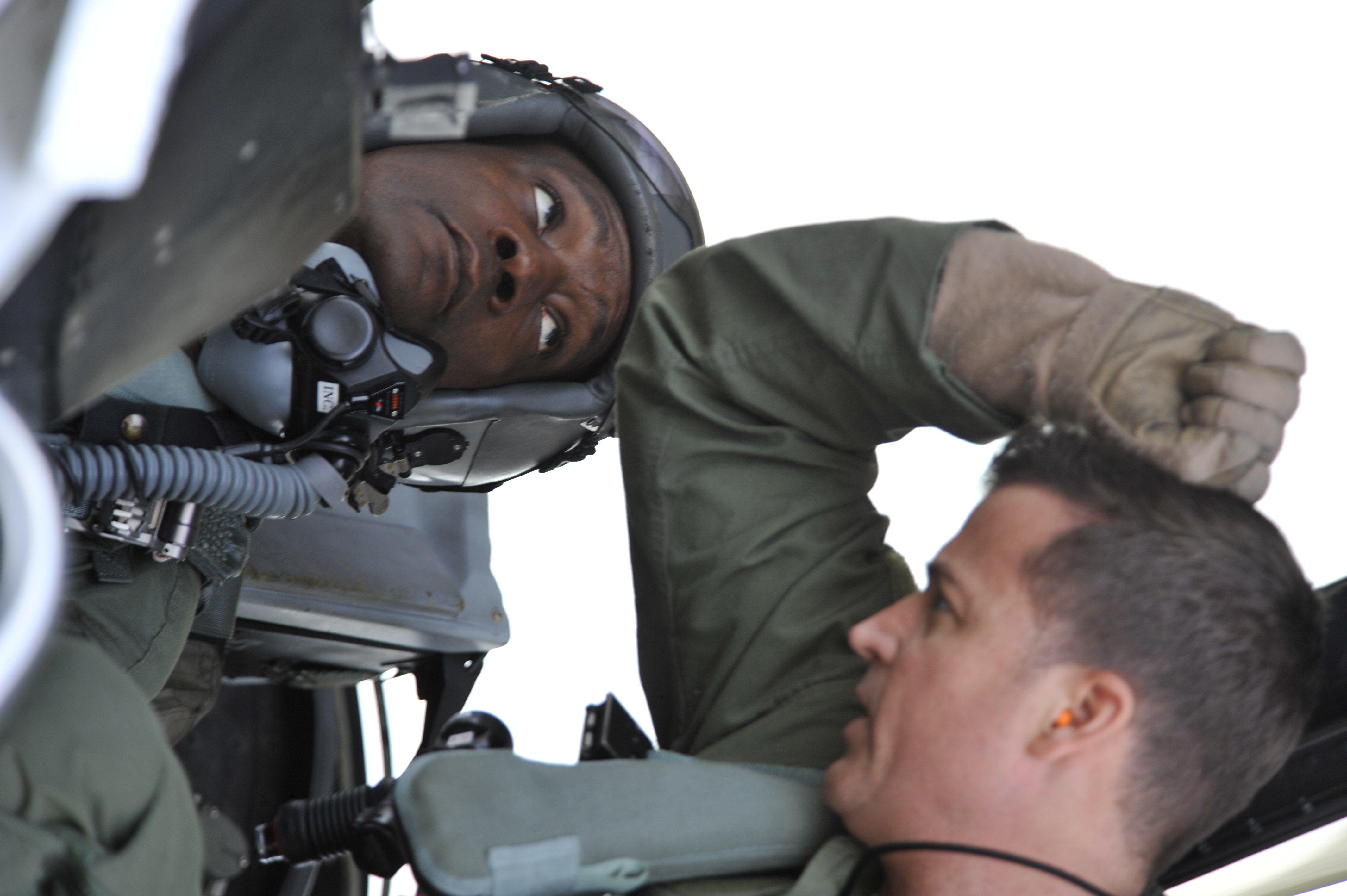 SHAW AFB - 20th Fighter Wing Commander Col. Charles Moore reviews safety procedures with Command Chief Master Sgt. Lefford Fate before conducting a Fini Flight while at Shaw AFB, S.C. on March 9, 2012. Moore will have his Change of Command on Mar. 19, 2012, while Fate will retire on May 1. (U.S. Air Force photo of Master Sgt. Cohen A. Young/Released)