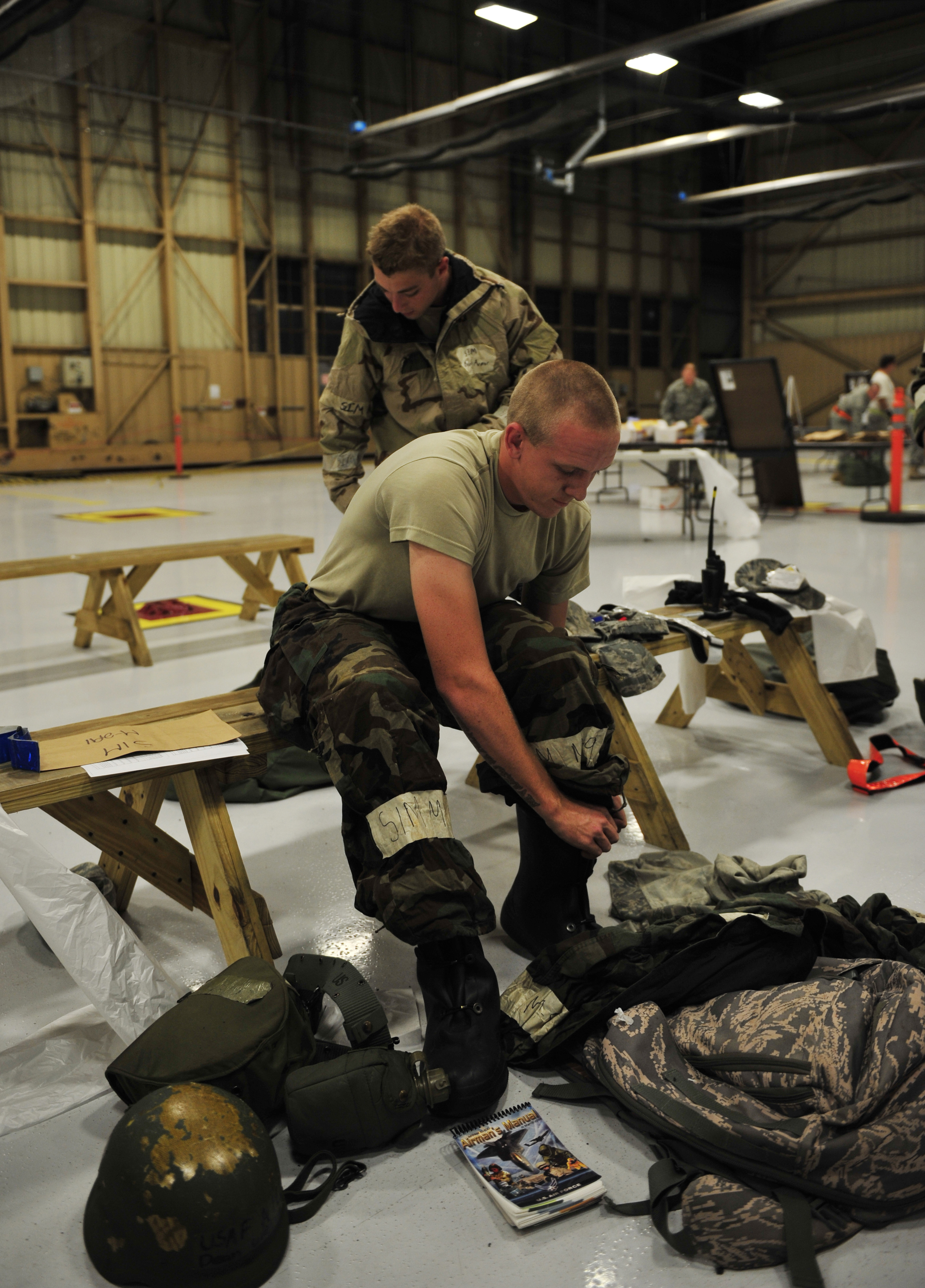 100830-F-4983M-005 SHAW AIR FORCE BASE, S.C. ? Senior Airman Dean Wright, 20th Civil Engineer Squadron dons Mission Oriented Protective Posture (MOPP) gear over boots during the Phase II Exercise Aug. 30, 2010. Members of the 20th Fighter Wing prepared for Phase II Exercise Sea Lion 10-07 by practicing how to prepare for deployments and base attacks Shaw performs routine exercises throughout the year to ensure Airmen are battle ready. (U.S. Air Force photo/Staff Sgt. Patrick Mitchell (Released))