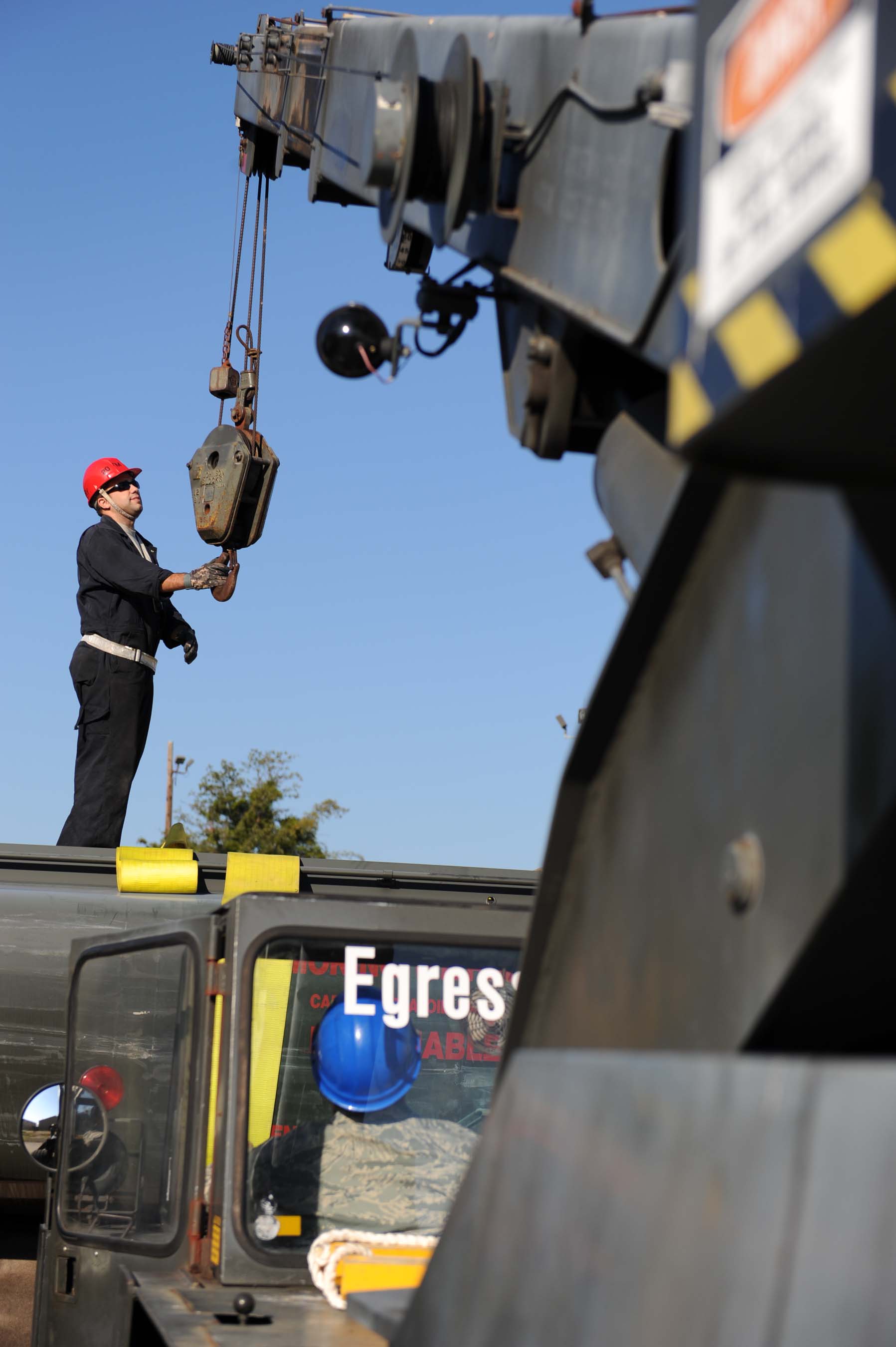 SHAW AIR FORCE BASE,S.C. -- Staff Sgt. Zachary Snook , 20th Equipment Maintenance Squadron wheel and tires NCO in charge, and other 20th EMS Airmen secure a crane strap to a 6,000-gallon fuel tank Oct. 1. Twentieth EMS and Logistics Readiness Squadron Airmen switched out a defective tank with an operational R-11 fuel truck with a crane used by 20th EMS crash and recovery saving $14,000 in repair costs. (U.S. Air Force photo/Senior Airman Matt Davis)