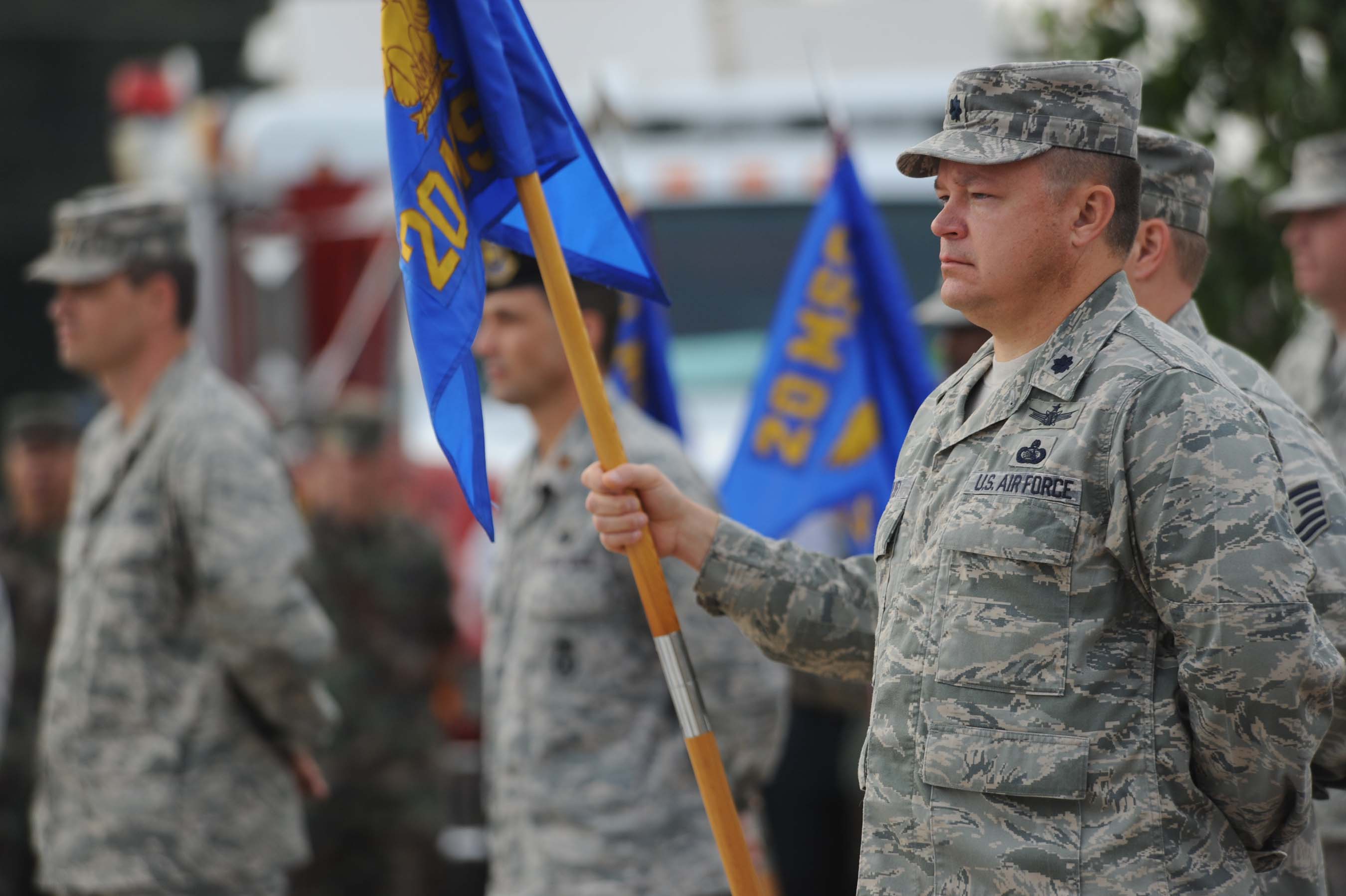 SHAW AIR FORCE BASE,S.C. -- Lieutenant Col. Brian Wilkey, 20th Communications Squadron commander, stands in formation listening while a list of names of military members killed in the 9/11 terrorist attacks is read. The colonel was participating in a rememberance ceremony here marking the 9/11 terrorist attacks Sept. 11, 2001. Airmen and civilians also remembered those who have given their lives on 9/11 and in the global war on terror. (U.S. Air Force photo/Senior Airman Matt Davis)