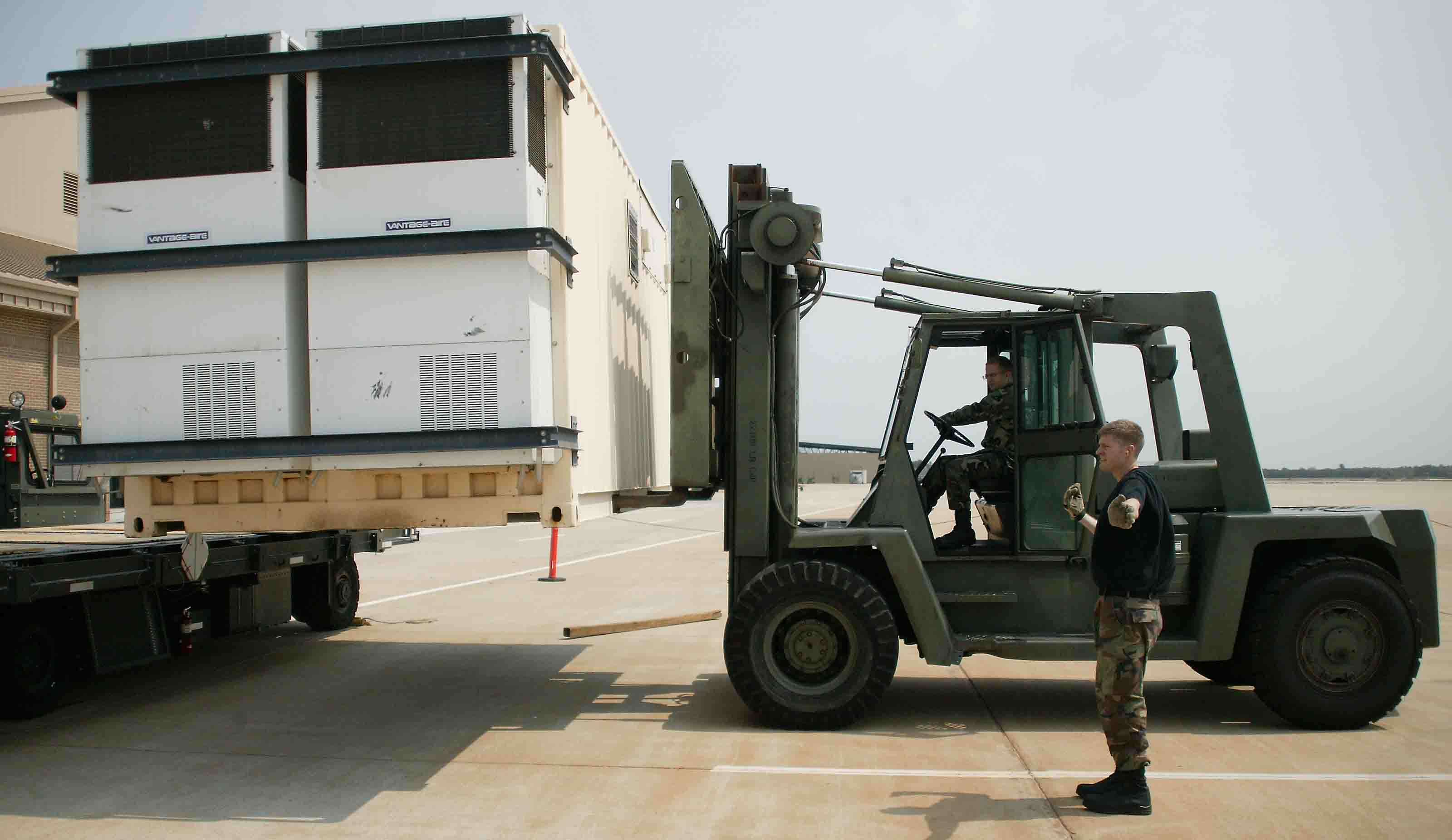 SHAW AIR FORCE BASE, S.C. -- Staff Sgt. Thomas Reeves, 20th Logistics Readiness Squadron air transportation journeyman, spots Airman 1st Class Mark Deaton, 20th LRS vehicle operations driver, as he loads a piece of cargo onto the k-loader May 17 in order to build a pallet train. They are part of the 20th LRS, Traffic Managment Flight. Their mission is to ensure the deployment of the 20th Fighter Wing personnel and cargo; anytime, anywhere and anyplace. (U.S. Air Force photo/Senior Airman John Gordinier)