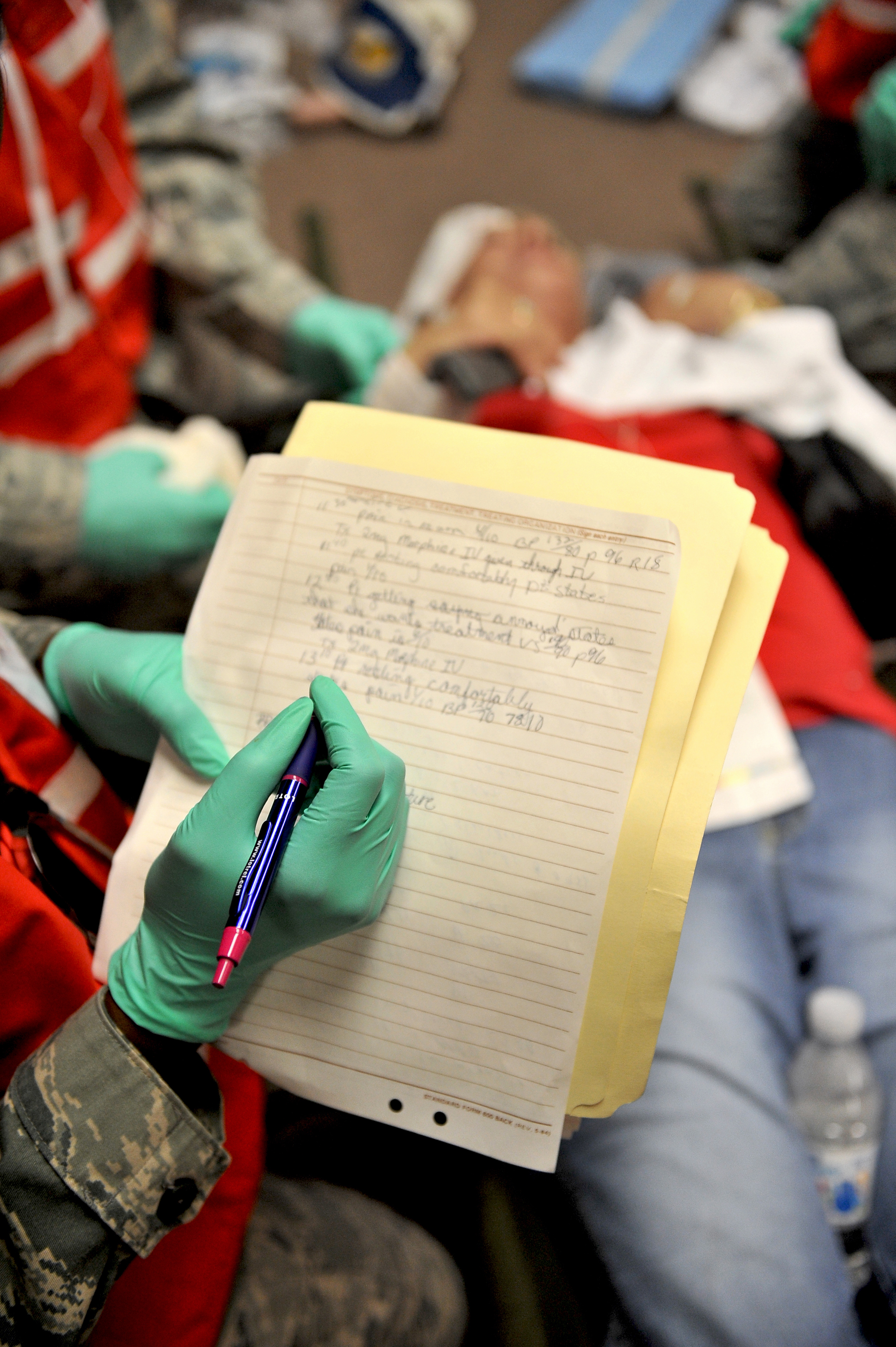 SHAW AIR FORCE BASE, S.C. -- The vital signs of a simulated casualty are written down during a major accident response exercise, Aug. 14. Testing the ability of an installation's emergency responders and medical teams to handle crisis situations, a MARE input can be anything from a hazardous material aircraft crash to a biochemical terrorist attack. (U.S. Air Force photo/Senior Airman Kathrine McDowell)
