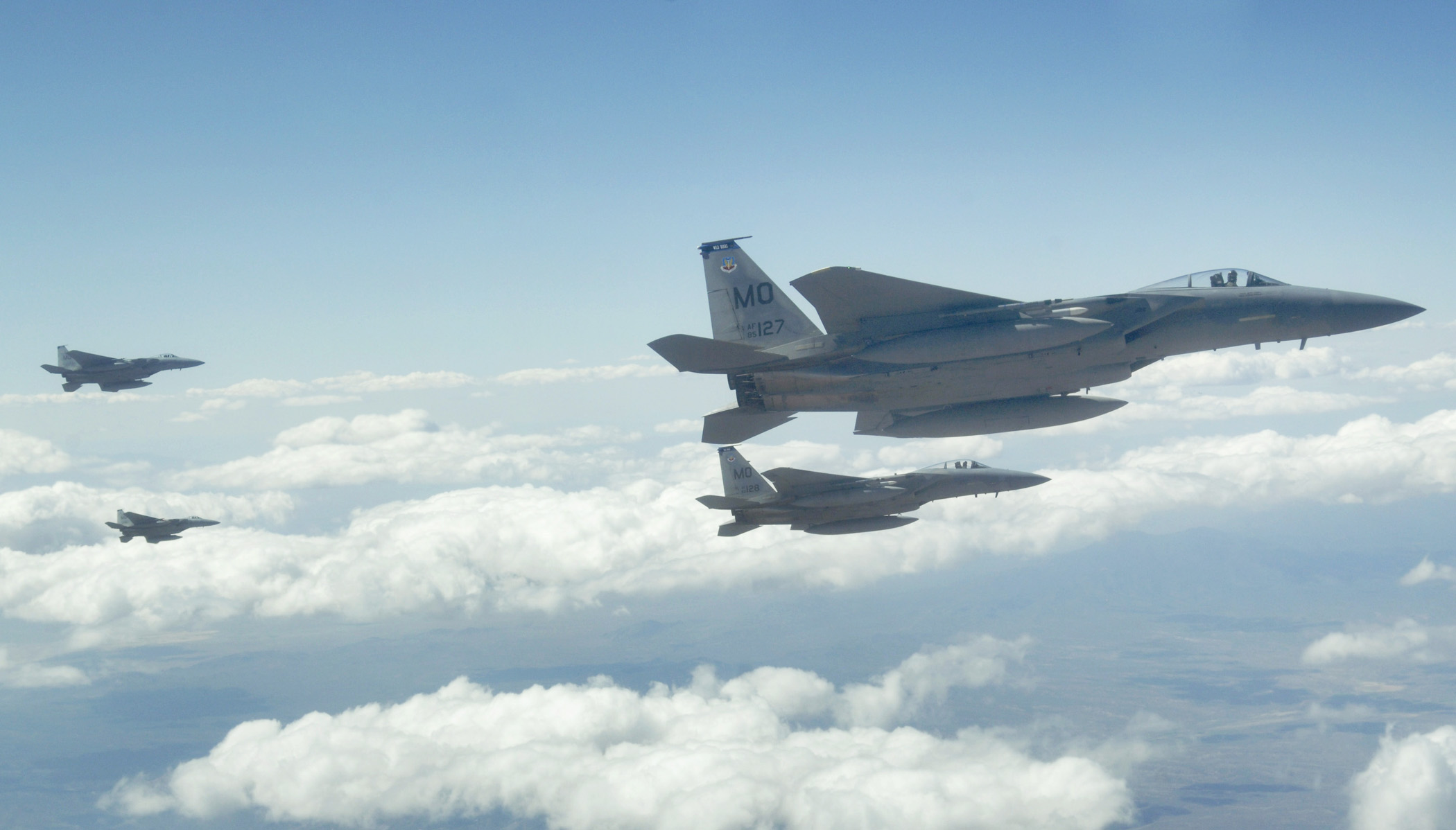 Four F-15 Eagles from Mountain Home Air Force Base, Idaho, head out to the Nevada Test and Training Range July 17 during Red Flag 09-4. Red Flag is conducted on the 15,000-square-mile range north of Las Vegas. The exercise is one of a series of advanced training programs administered by the U.S. Air Force Warfare Center and Nellis AFB. (U.S. Air Force photo/Master Sgt. Kevin J. Gruenwald)
