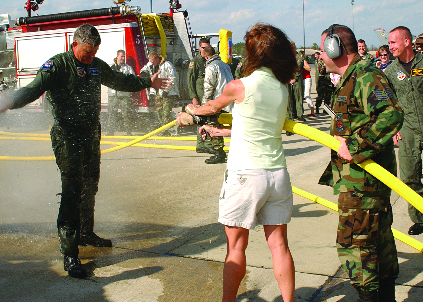 Col. Joel Malone, 20th Operations Group commander, is sprayed with water March 13 by his wife, Sandy, after completing his final flight in an F-16 at Shaw. Col. Malone will become the 35th Fighter Wing vice commander at Misawa Air Base, Japan.