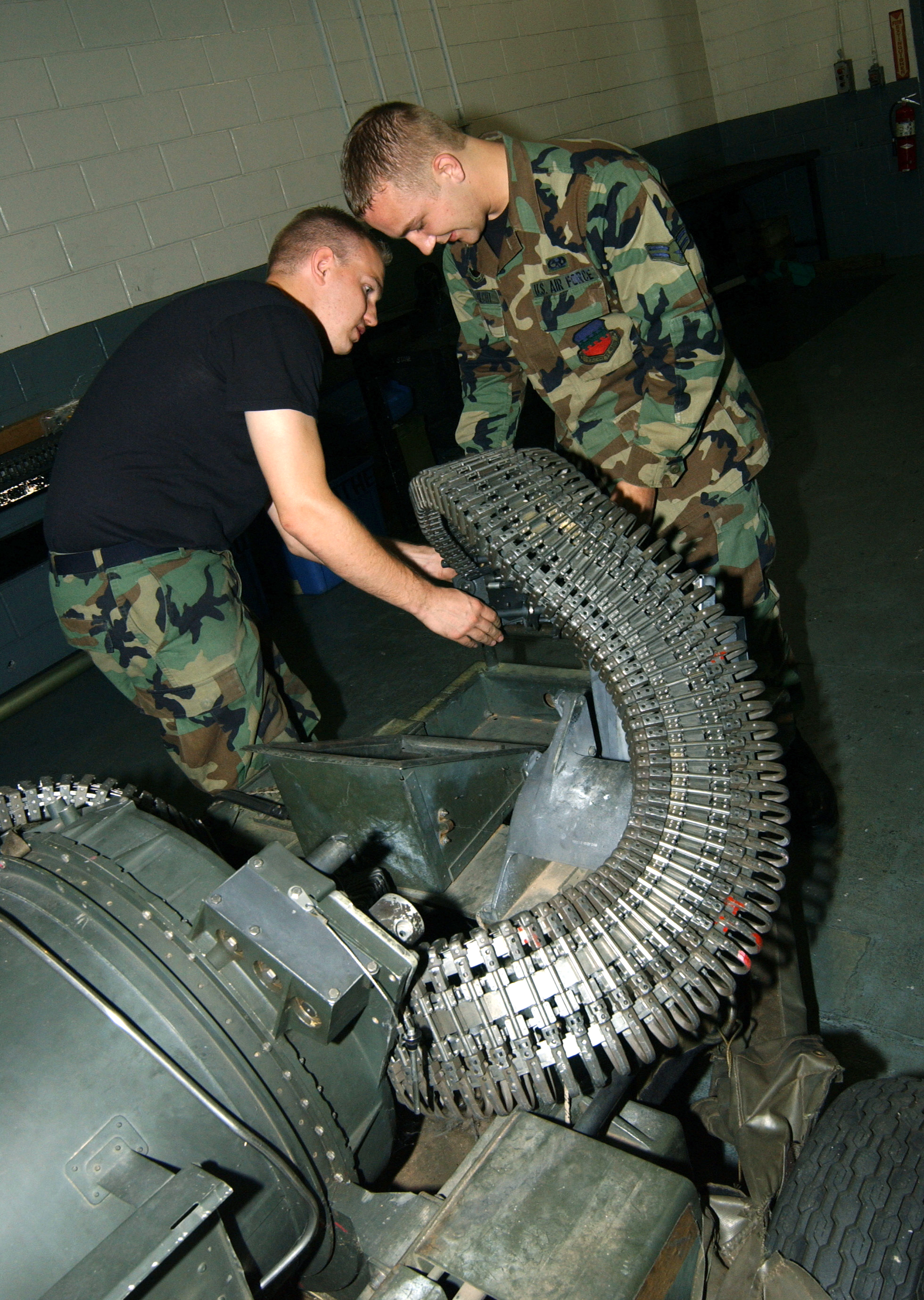 SHAW AIR FORCE BASE, S.C. -- Airmen 1st Class Narley Wright and Brandon Liebrecht perform a linkage adjustment on a universal ammunition loading system here Sept. 22. Both Airmen are assigned to the 20th Equipment Maintenance Squadron. (U.S. Air Force photo by Airman 1st Class Amber McCarthy)