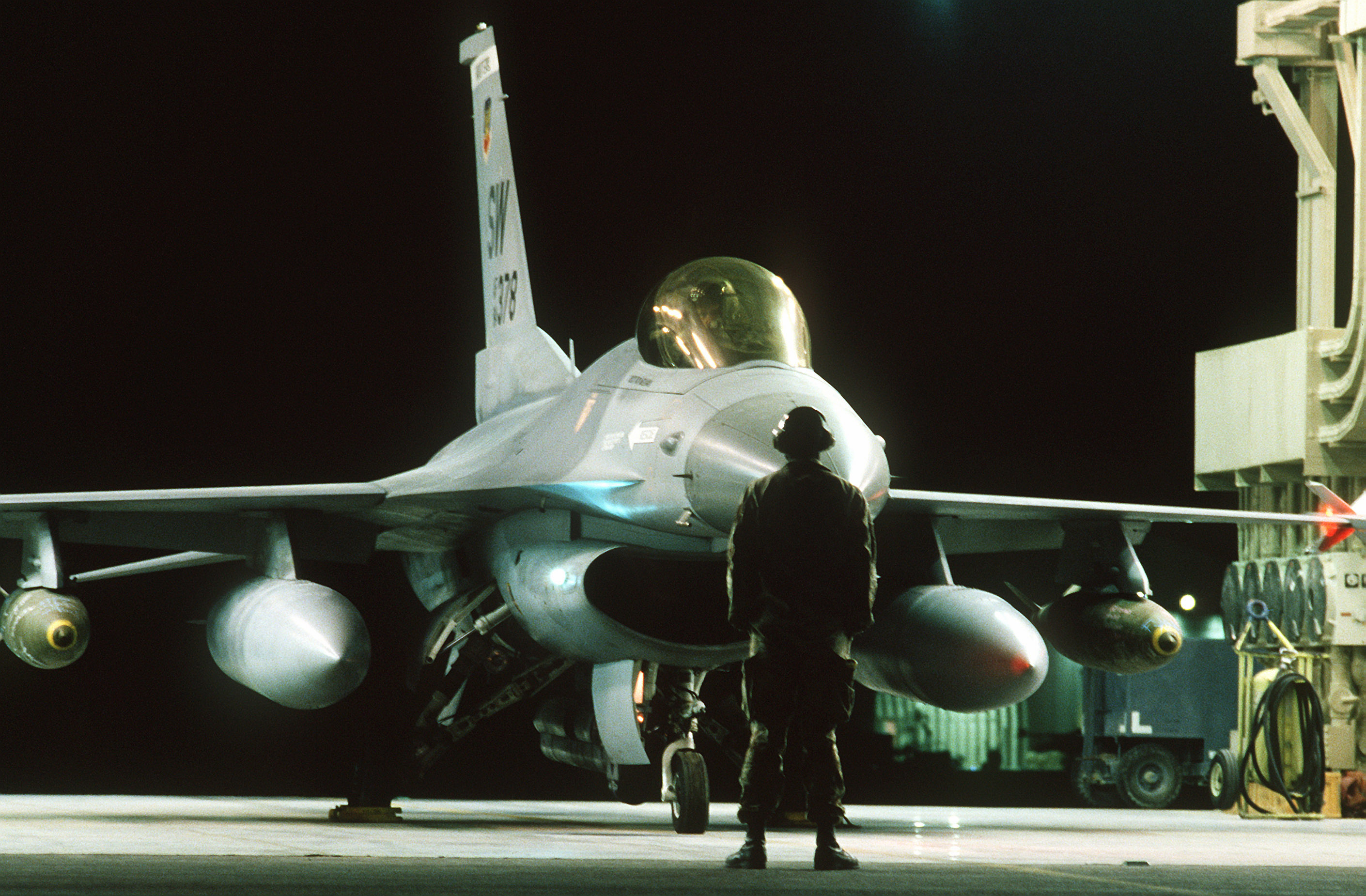 1990's -- Sgt. Ken Mahaley, crew chief, 17th Avionics Squadron, launches an F-16C Fighting Falcon fighter aircraft of the 363rd Tactical Fighter Wing, Shaw Air Force Base, S.C., during the first wave of the air attack on Iraq in support of Operation Desert Storm. The Falcon is armed with Mark 84 2,000-pound bombs mounted under its wings.