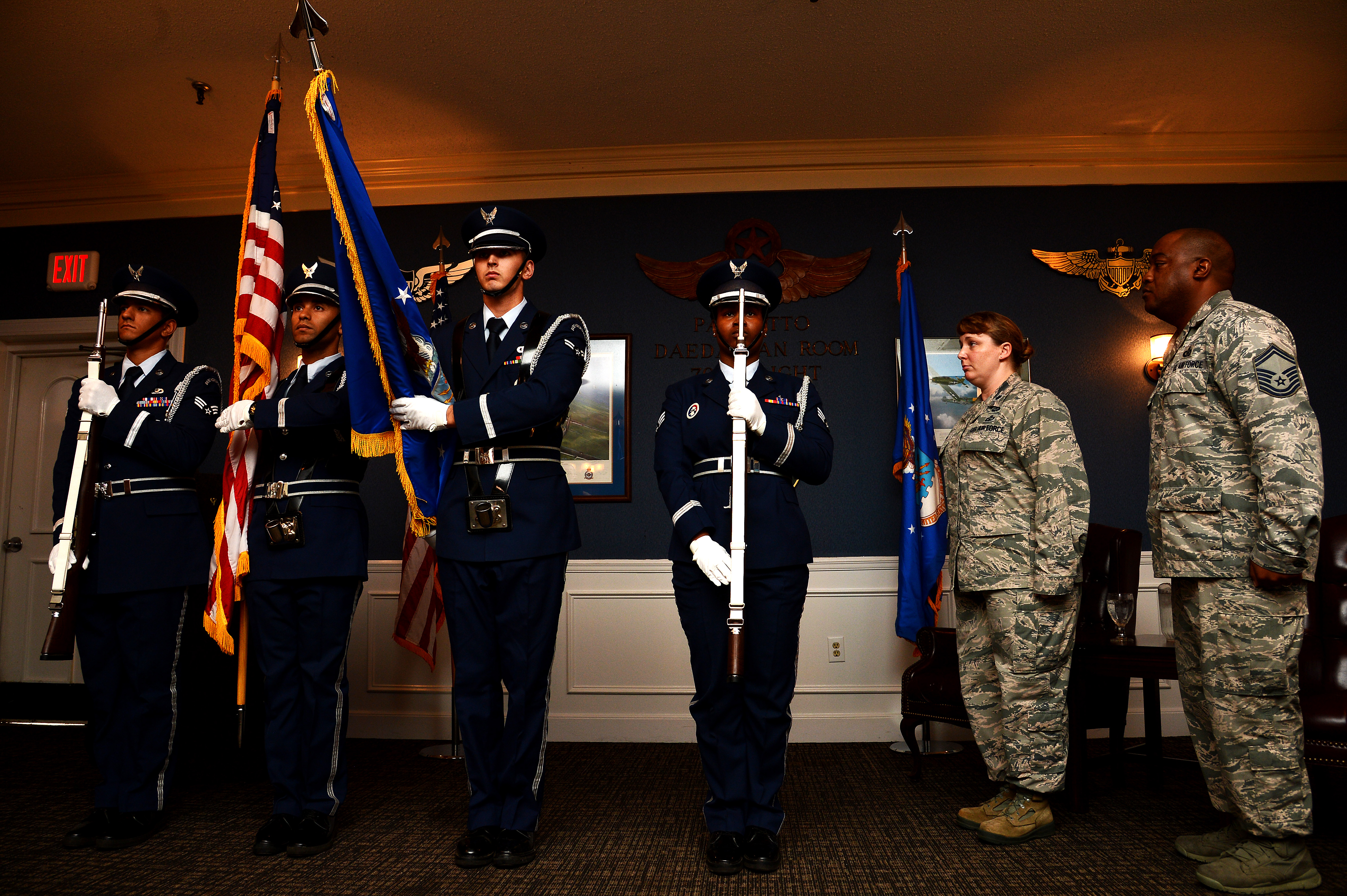 The 20th Force Support Squadron Honor Guard post the colors during the retirement ceremony for Senior Master Sgt. Anthony Matthews, the airfield functional area manager for U.S. Air Forces Central, at Shaw Air Force Base, S.C., Nov. 6, 2015. Along with retirement ceremonies, honor guard Airmen perform details at funerals, balls, and promotion ceremonies. (U.S. Air Force photo by Senior Airman Jonathan Bass)