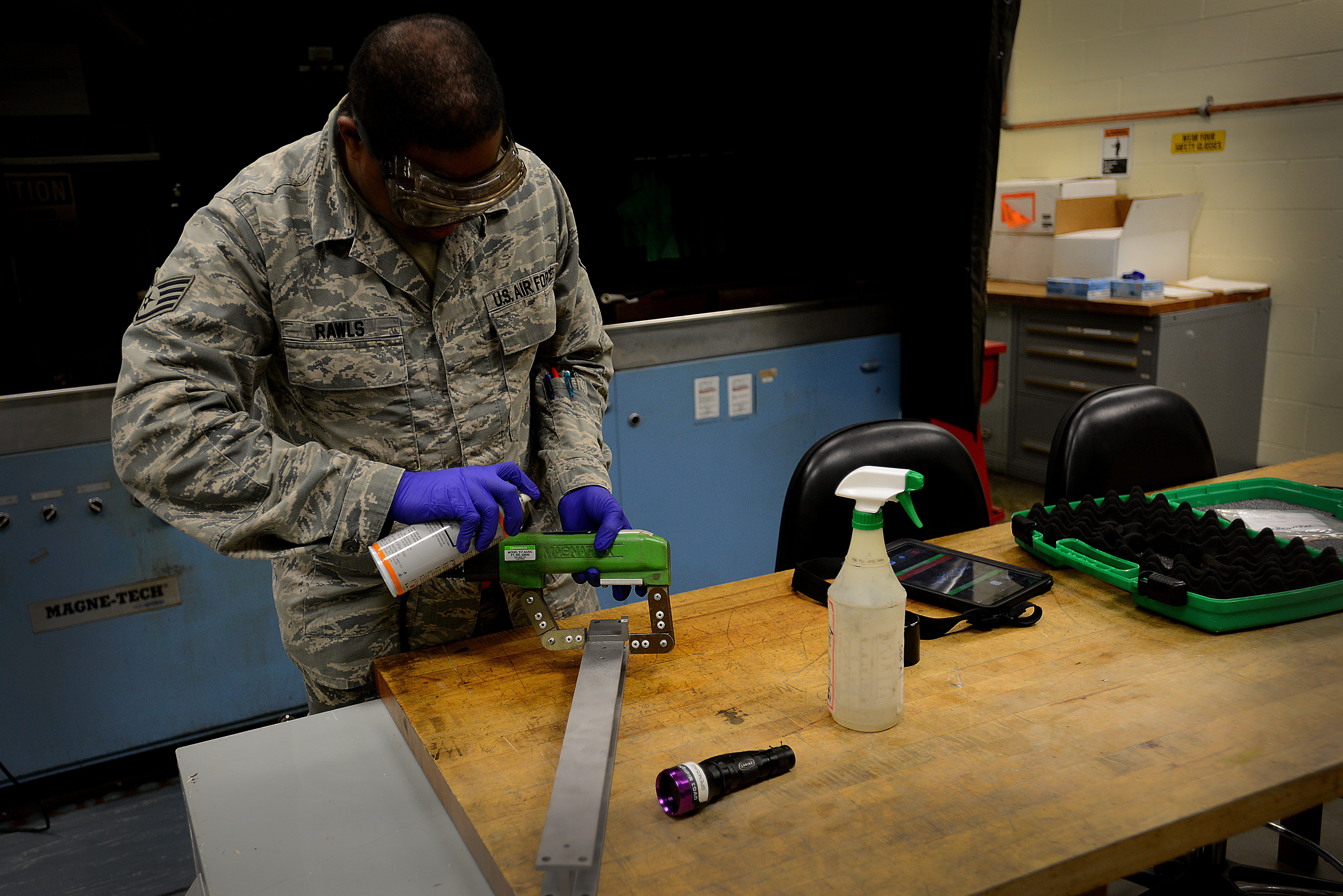 U.S Air Force Staff Sgt. Domonik Rawls, 20th Equipment Maintenance Squadron Nondestructive Inspections craftsman, induces a magnetic field on a piece of metal at Shaw Air Force Base, S.C., Feb. 3, 2016. When viewed under a blacklight, the fluorescent glow of the magnetic field allows for NDI Airmen to easily spot damage and imperfections. (U.S. Air Force photo by Airman 1st Class Kelsey Tucker)